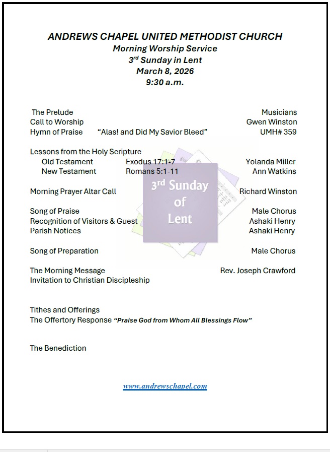Andrews Chapel UMC Click for Facebook Live Streaming – Click To View Program – – – – – – – – Click to Join Zoom Class – – – Click to Read Charge Conference – –